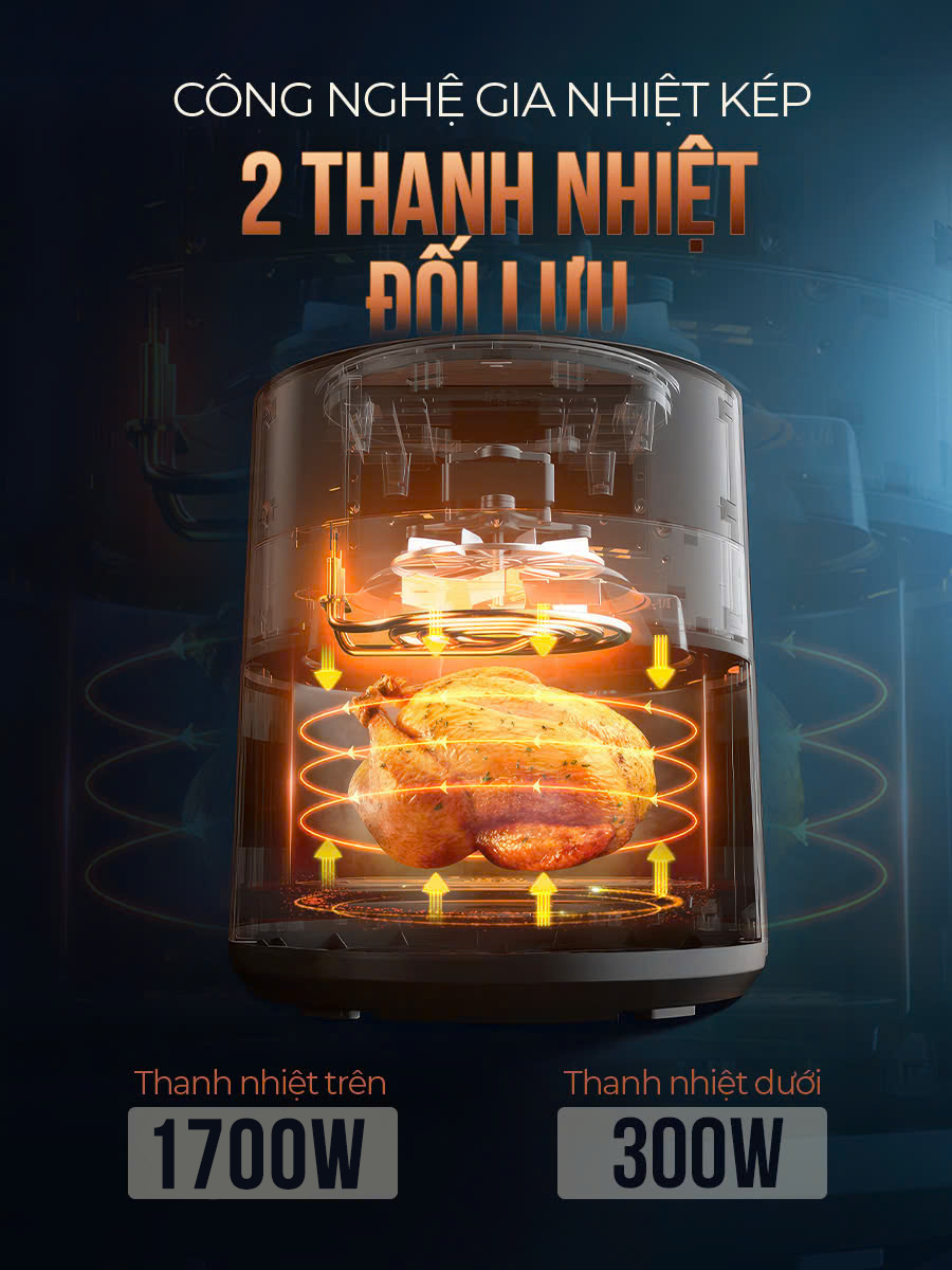 Với 2 thanh nhiệt đối lưu trên dưới, khi nồi chiên làm việc, nhiệt sẽ được tỏa ra đều khắp khoang nồi, tuần hoàn đối lưu giúp thực phẩm chín đều từ trong ra ngoài.