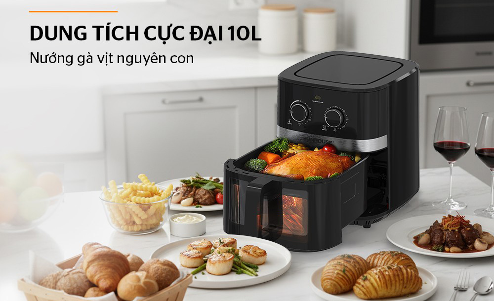 Nồi chiên không dầu Sunhouse SHD4039 sở hữu dung tích lớn 10 lít thoải mái chiên nướng gà, vịt nguyên con mà không cần lật đảo trong quá trình chế biến.