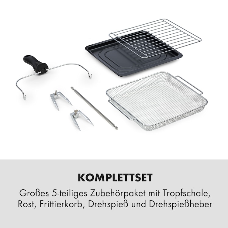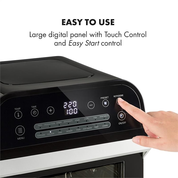 Nhiệt độ có thể được đặt theo mức tăng 10 ° C từ 50 đến 220 ° C và thời gian nấu trong 1 phút tăng lên đến 60 phút. Có 13 chương trình để bạn lựa chọn như khoai tây chiên, pizza, bánh ngọt, cá, rau củ hay thịt gà cũng như 3 chức năng rã đông, giữ ấm và sấy khô.