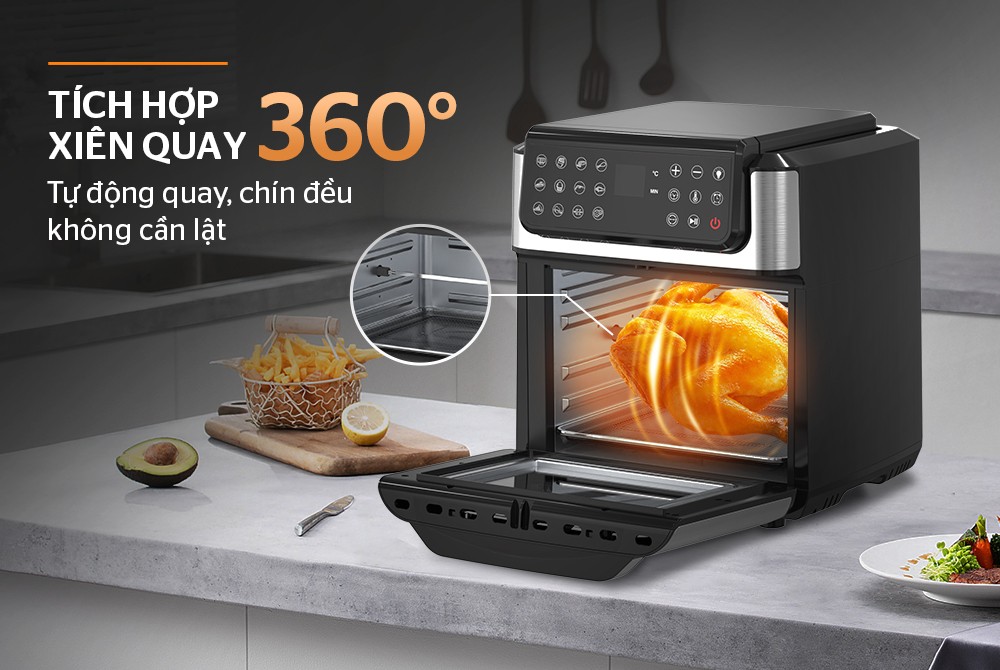 Đặc biệt, còn tích hợp xiên quay 360° thông minh, giúp thực phẩm tự động xoay và chín đều mọi mặt mà không cần lật trở. Nhờ luồng khí nóng đối lưu kết hợp cơ chế quay liên tục, món ăn đạt độ vàng giòn hấp dẫn bên ngoài nhưng vẫn mềm ẩm bên trong, hạn chế cháy xém hiệu quả. Tính năng này đặc biệt phù hợp khi quay gà nguyên con, thịt khối lớn hoặc hải sản, mang đến trải nghiệm nấu ăn tiện lợi, tiết kiệm thời gian và chất lượng món ăn chuẩn nhà hàng ngay tại nhà.