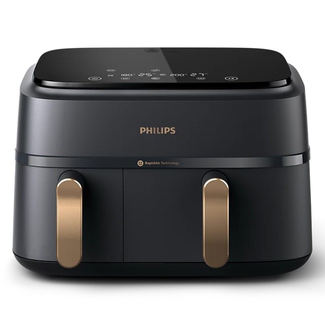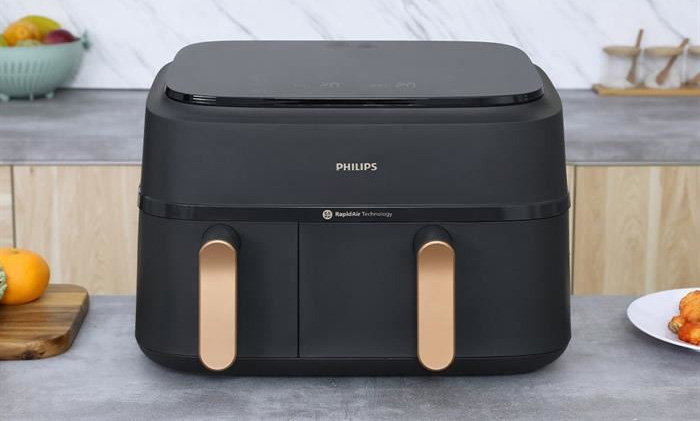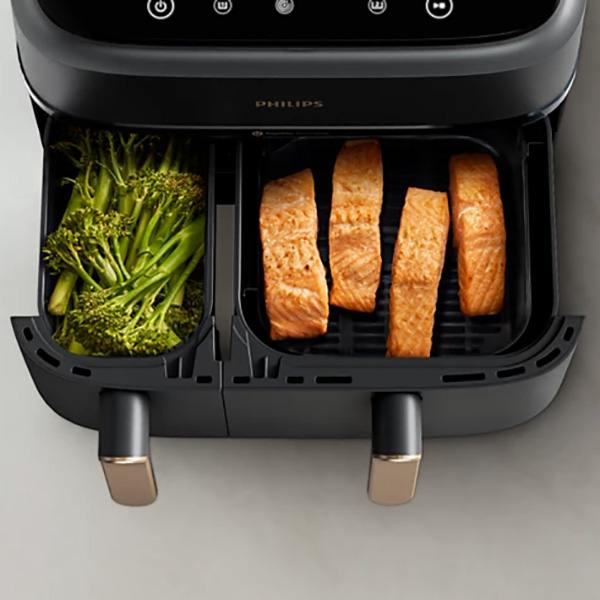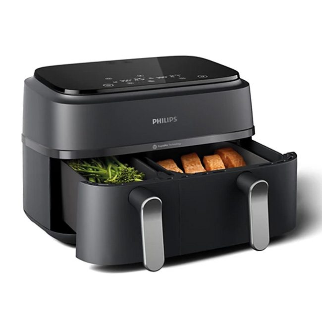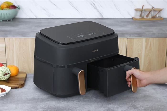 Nồi chiên không dầu Philips Airfryer NA352/00 sở hữu dung tích lớn 9.0 lít thoải mái chiên nướng gà, vịt, cá, sườn bò, heo da giòn,...Với thiết kế 2 ngăn riêng biệt, nồi chiên sẽ đáp ứng tốt nhu cầu trong gia đình, đặc biệt là gia đình đông thành viên.