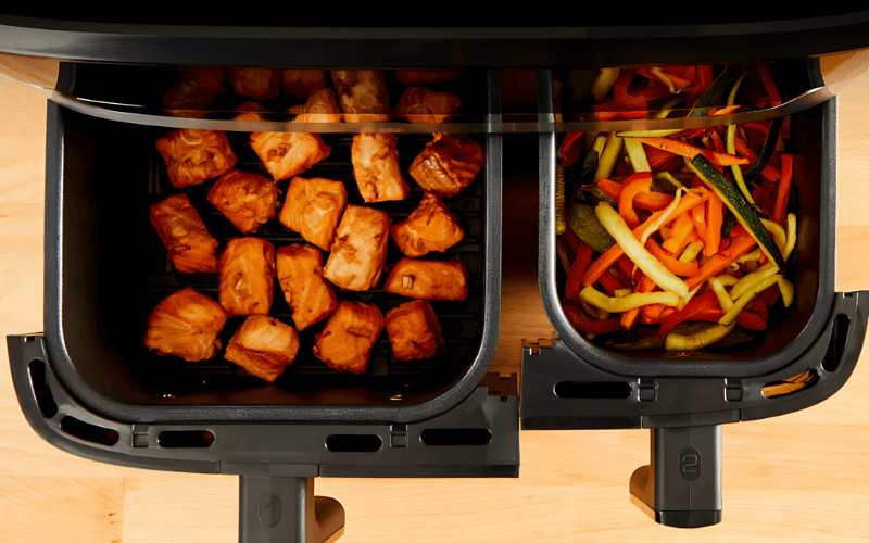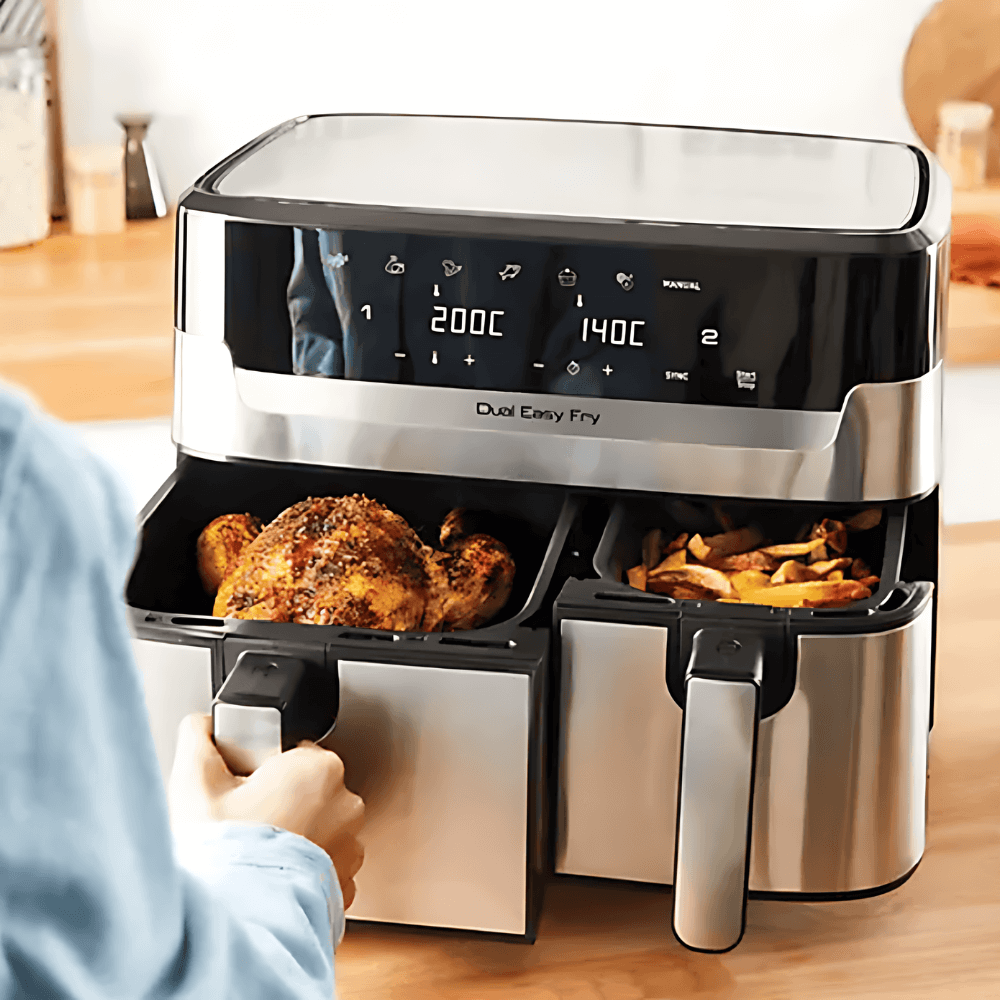 Nồi chiên không dầu Tefal EY905D10 có 2 ngăn (3.1 lít và 5.2 lít), bạn có thể thiết lập chương trình chiên nướng cho từng ngăn hoặc cả 2 ngăn cùng 1 lúc.