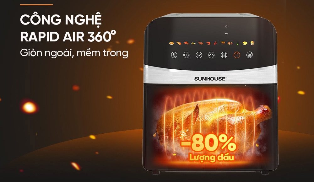 Nhiệt tỏa đều và tuần hoàn liên tục khắp khoang chiên, thực phẩm được chín đều mà không cần thêm dầu mỡ, giòn bên ngoài - mềm bên trong. Lượng mỡ thừa từ thực phẩm còn được tự động tách ra và chảy xuống khay hứng ở phía dưới, giúp giảm đến 80% lượng mỡ thừa. Món ăn chế biến từ nồi chiên không dầu rất tốt cho sức khỏe. Nhất là với những người đang gặp các vấn đề như tiểu đường, béo phì…, cần hạn chế tối đa lượng dầu mỡ nạp vào cơ thể thì đây chính là một lựa chọn hoàn hảo khi chế biến món ăn.