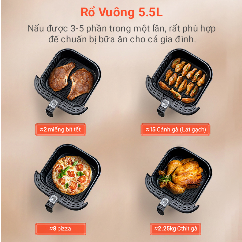 - Nồi chiên không dầu Cosori CP-158-AF-RAB có dung tích 5.5 lít, khoang rộng rãi, rất thuận tiện cho việc sắp xếp thực phẩm khi chế biến.