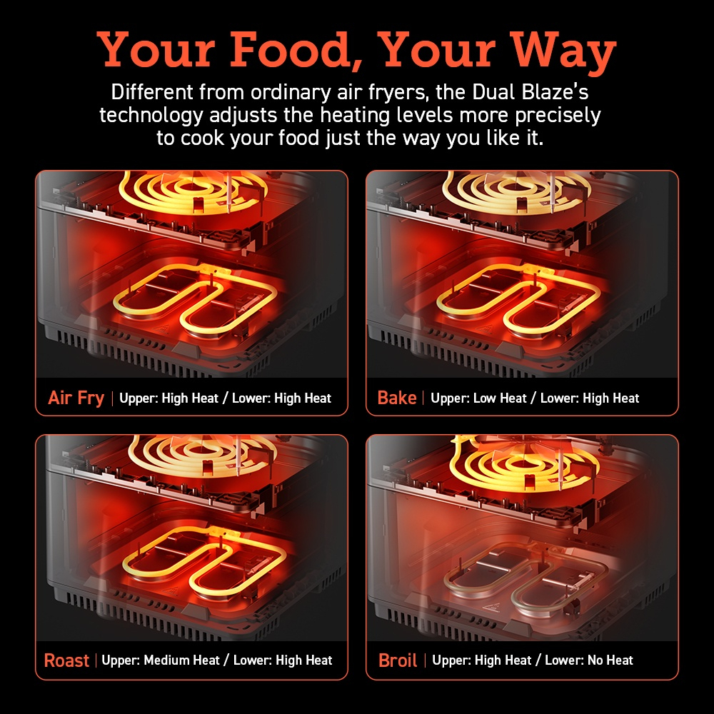 - Không giống những nồi chiên không dầu thông thường, Cosori CAF-P583S-KEU lắp đặt công nghệ Dual Element điều chỉnh mức nhiệt chính xác, như vậy thức ăn sẽ giữ trọn hương vị, bổ dưỡng mà không lo bị cháy khét và lãng phí.