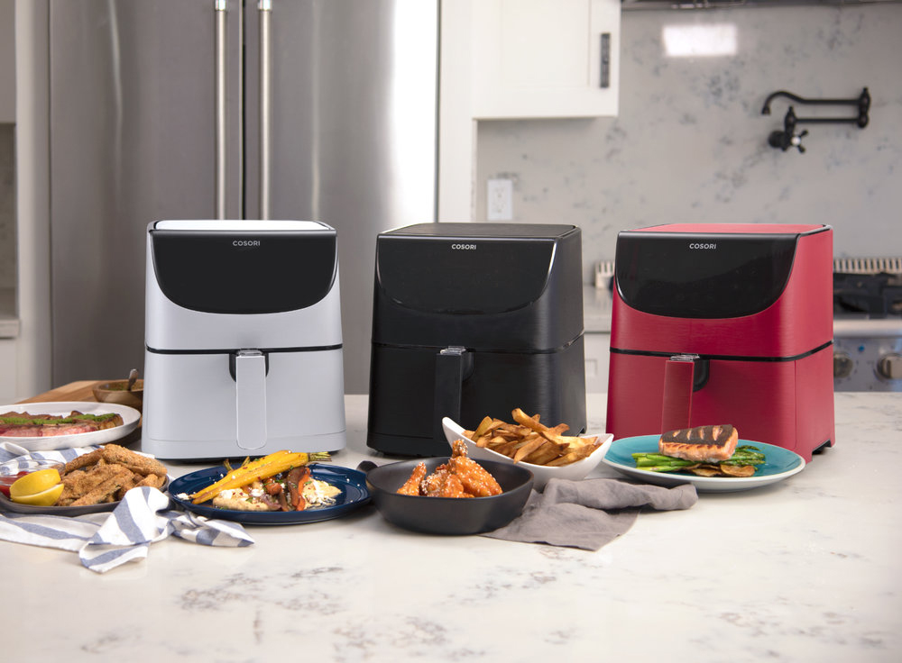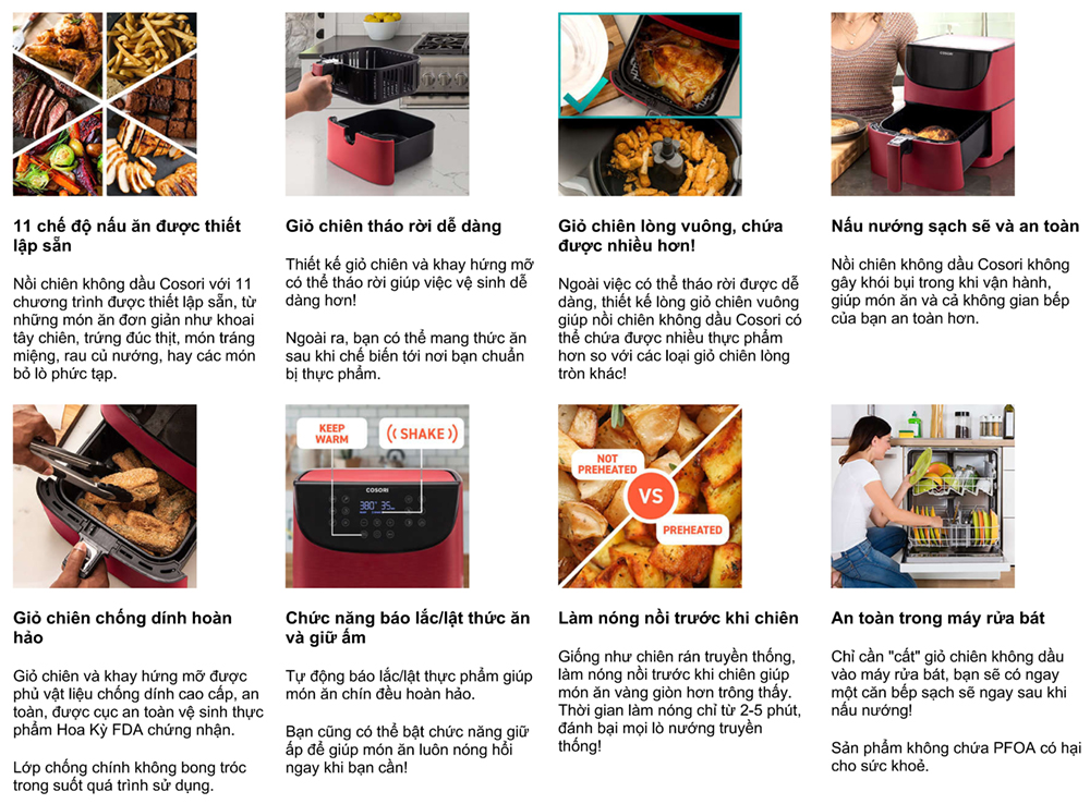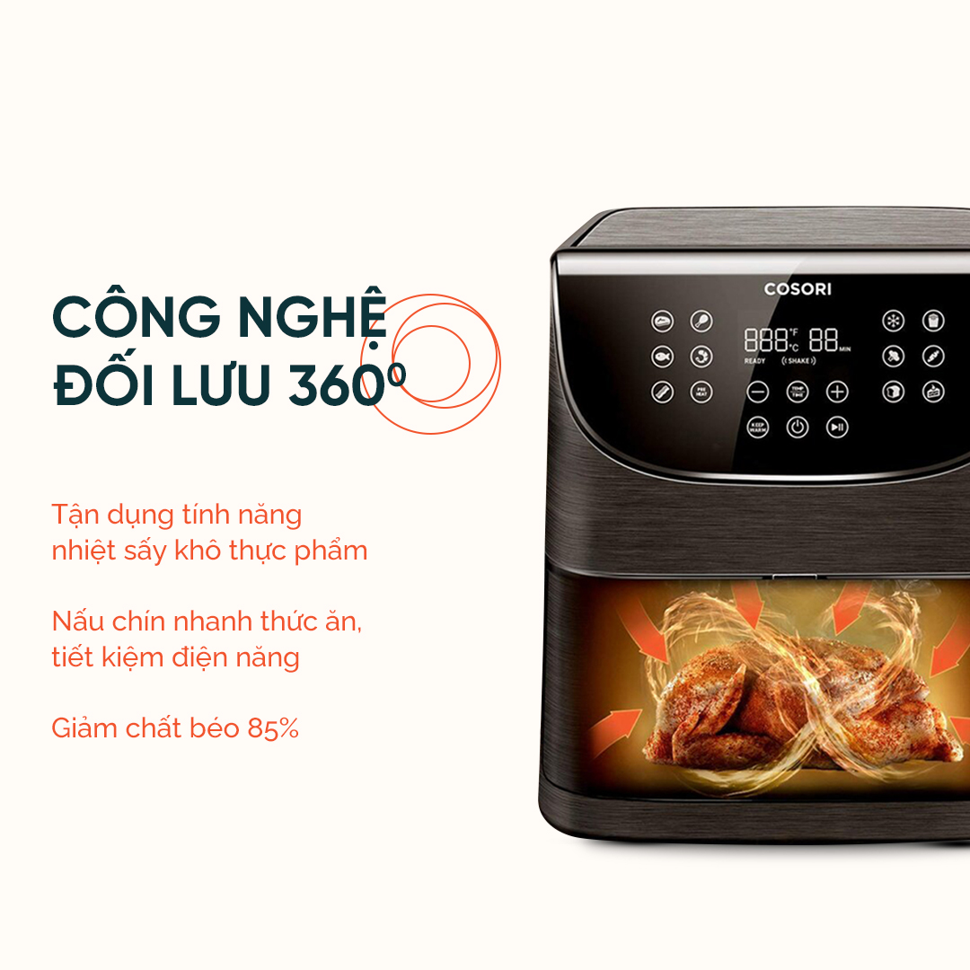 - Nồi chiên không dầu Cosori giúp giảm đến hơn 85% chất béo trong thức ăn so với các phương pháp chiên, rán truyền thống. Thức ăn không dầu mỡ, không bị ám khói, giữ nguyên vẹn hương vị thơm ngon.