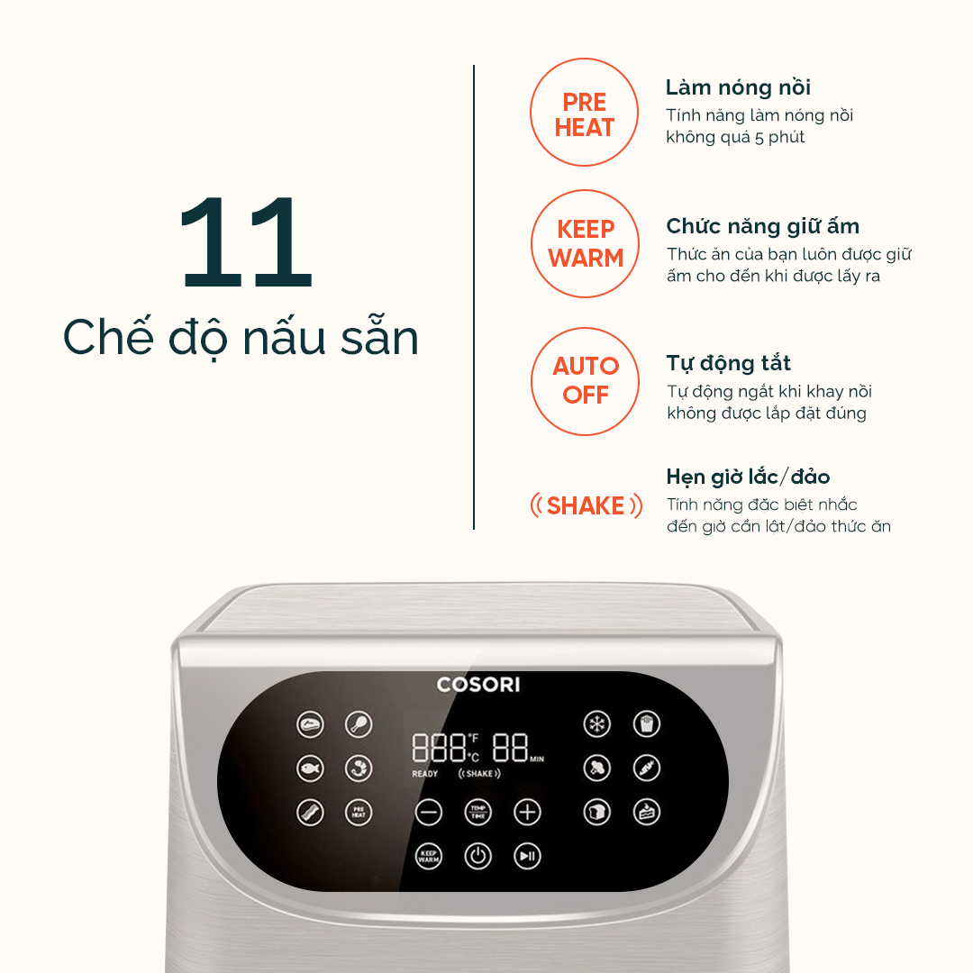- Nồi chiên không dầu Cosori có chức năng “Keep Warm/Giữ Ấm” giúp giữ thức ăn nóng giòn cho tới khi dùng bữa.