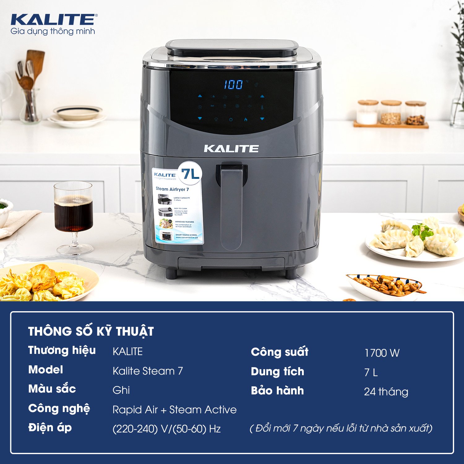 - Với khay chứa nước đến 1L, Kalite Steam 7 làm chín đồ ăn bằng hơi nước siêu nhiệt trong môi trường kín, nâng tầm các món hấp thông thường, lưu giữ trọn vẹn dinh dưỡng, hương thơm, vị ngọt của thực phẩm.
