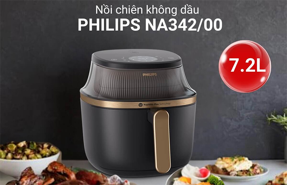 Nồi chiên không dầu Philips Airfryer NA342/00 sở hữu dung tích lớn 7.2 lít thoải mái chiên nướng gà, vịt, cá, sườn bò, heo da giòn,...đáp ứng tốt nhu cầu trong gia đình, đặc biệt là gia đình đông thành viên.