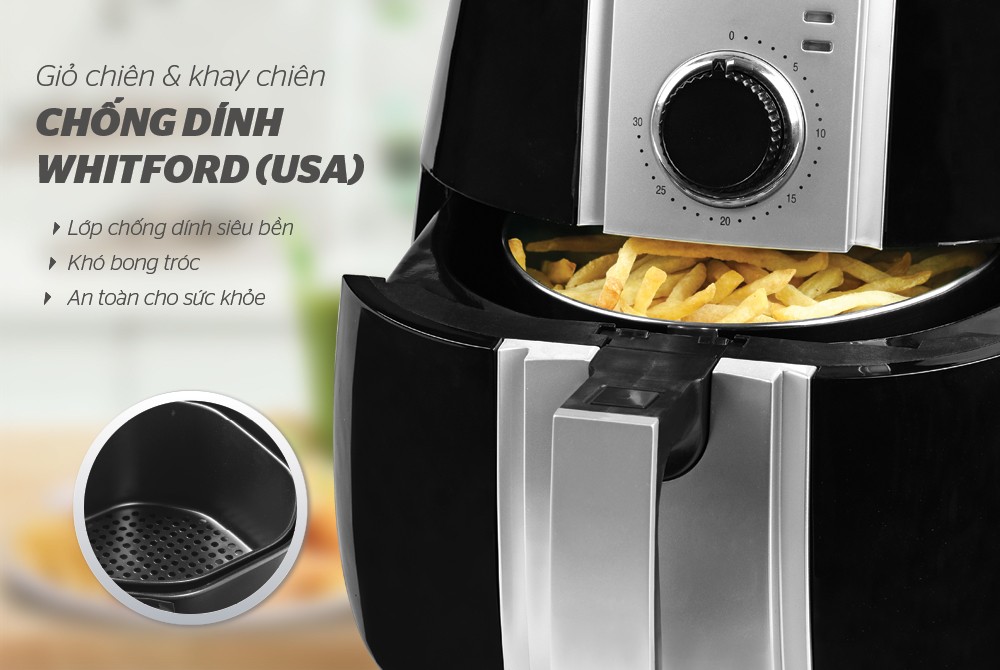 Giỏ chiên và khay chiên được phủ chống dính cao cấp Whitford (USA) giúp cho lớp chống dính được bền hơn, khó bong tróc và an toàn cho sức khỏe người dùng. Giỏ chiên được thiết kế dạng tổ ong giúp lượng mỡ thừa dễ dàng chảy xuống khay hứng mỡ thừa phía dưới, không thấm ngược vào sản phẩm gây cảm giác ngấy mỡ hay nạp quá nhiều mỡ vào cơ thể. Sự có mặt của khay hứng mỡ thừa còn giúp dễ dàng vệ sinh sản phẩm hơn.