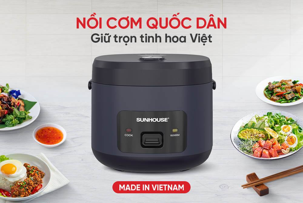 Nồi cơm điện 1.2 lít Sunhouse SHD8219 là sản phẩm được sản xuất 100% tại Việt Nam, mang đến sự tiện lợi và chất lượng cho bữa cơm gia đình.
