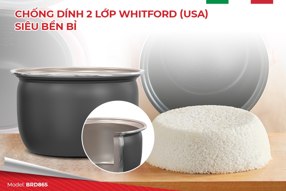 Công nghệ chống dính cao cấp Whitford (Hoa Kỳ) giúp hạn chế tối đa sự bán dính của cơm, giúp cơm ngon, dễ dàng vệ sinh sau khi nấu và đặc biệt an toàn với sức khỏe.