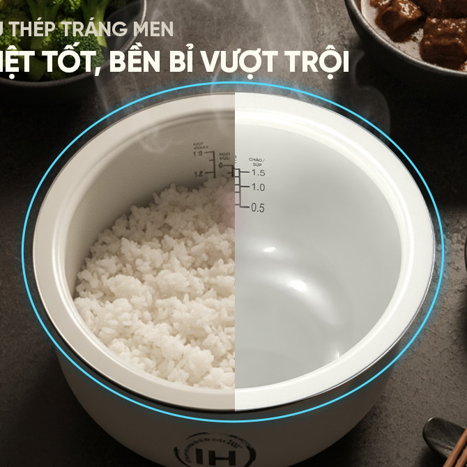 Lòng nồi thép tráng men cao cấp dạng niêu có khả năng giữ nhiệt tốt, hỗ trợ quá trình nấu và ủ cơm hiệu quả hơn. Bề mặt tráng men bền bỉ giúp hạn chế trầy xước, dễ vệ sinh và an toàn cho sức khỏe. Thiết kế dạng niêu giúp tăng khả năng tích nhiệt, mang lại hương vị cơm đậm đà, dẻo thơm tự nhiên. Bên trong lòng nồi có vạch định lượng giúp bạn cân chỉnh lượng thức ăn phù hợp.