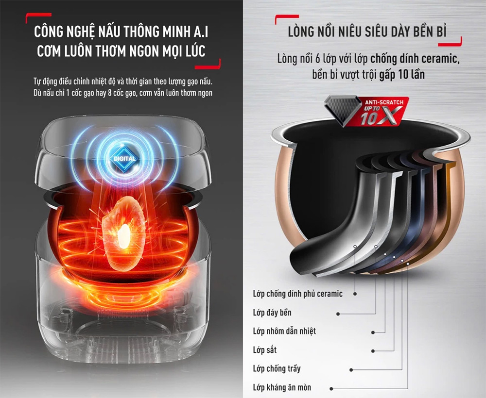 Với công nghệ AI thông minh giúp tự điều chỉnh thời gia và nhiệt độ trong các giai đoạn khác nhau, giúp cơm chín đều và kiểm soát được độ cứng của hạt cơm. Công nghệ nấu cao tần IH thế hệ mới giúp hạt gạo nở bung, đồng đều, giữ trọn vị ngon trong từng hạt cơm.