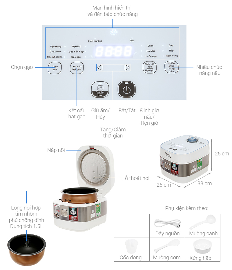 | Phụ kiện | muỗng cơm, muỗng canh, ca đong, xửng hấp |