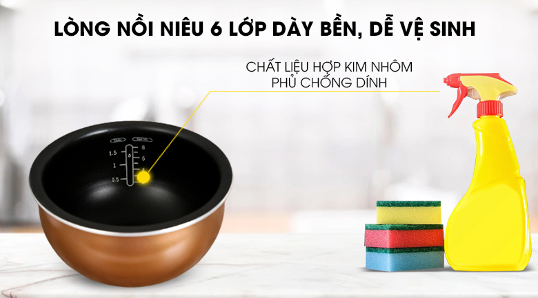 Nồi cơm điện cao tần Tefal sở hữu lòng nồi dạng niêu 6 lớp kim loại dày gần 3mm được phủ lớp chống dính độc quyền Tefal không gây sản sinh các chất độc hại, giúp đảm bảo an toàn cho sức khỏe người dùng, dễ dàng vệ sinh lau chùi sau mỗi lần sử dụng.