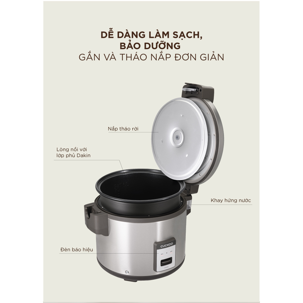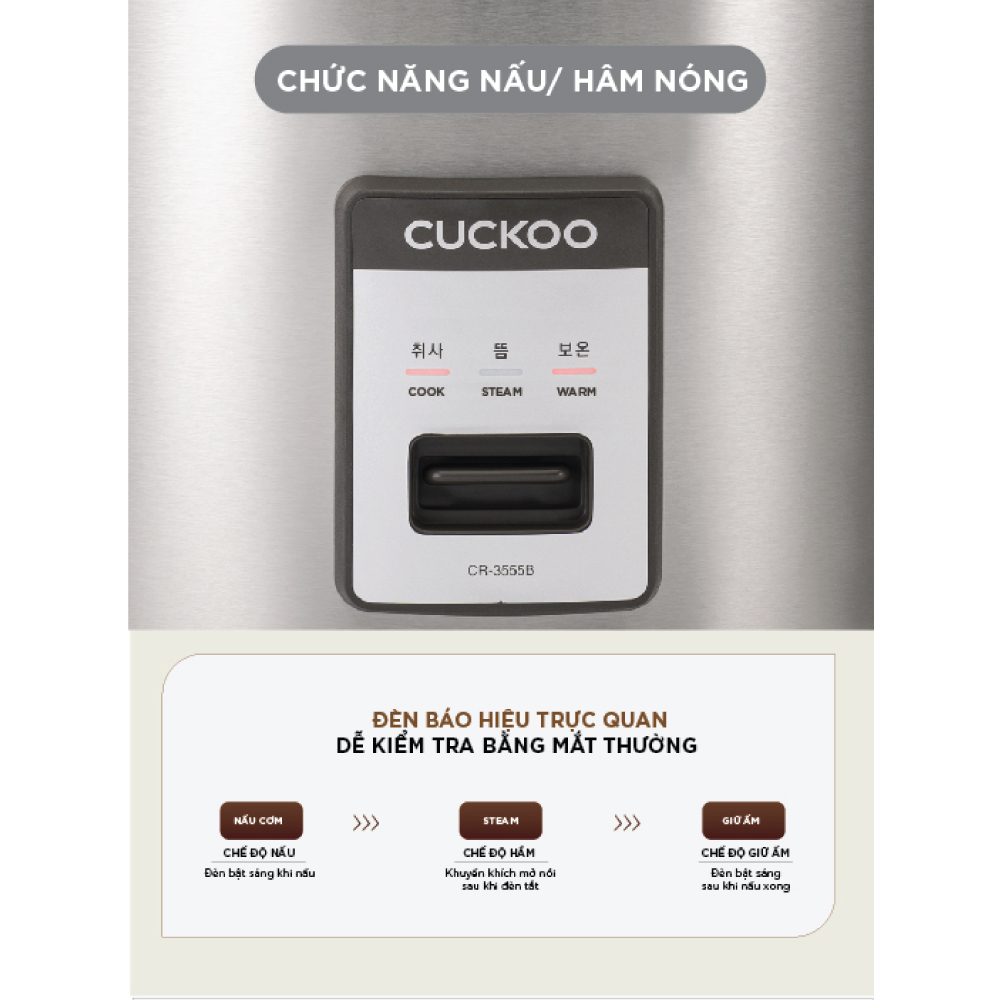 Nồi cơm điện công nghiệp Cuckoo CR-3555 có 3 chức năng nấu cơm, hầm và hâm nóng dễ dàng được điều khiển bằng nút gạt. Ngoài ra, nồi cơm điện này còn có khả năng giữ nhiệt cực tốt, duy trì độ ẩm đồng đều khắp lòng nồi, đảm bảo chất lượng của từng hạt cơm.