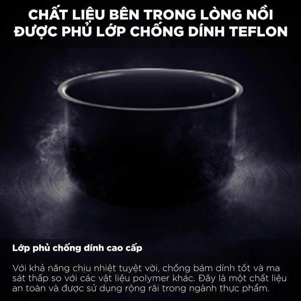 Lòng nồi được phủ lớp chống dính Teflon cao cấp, giúp hạn chế tình trạng cơm dính vào đáy nồi, không chỉ giúp cơm chín ngon hơn mà còn dễ dàng vệ sinh sau khi sử dụng.