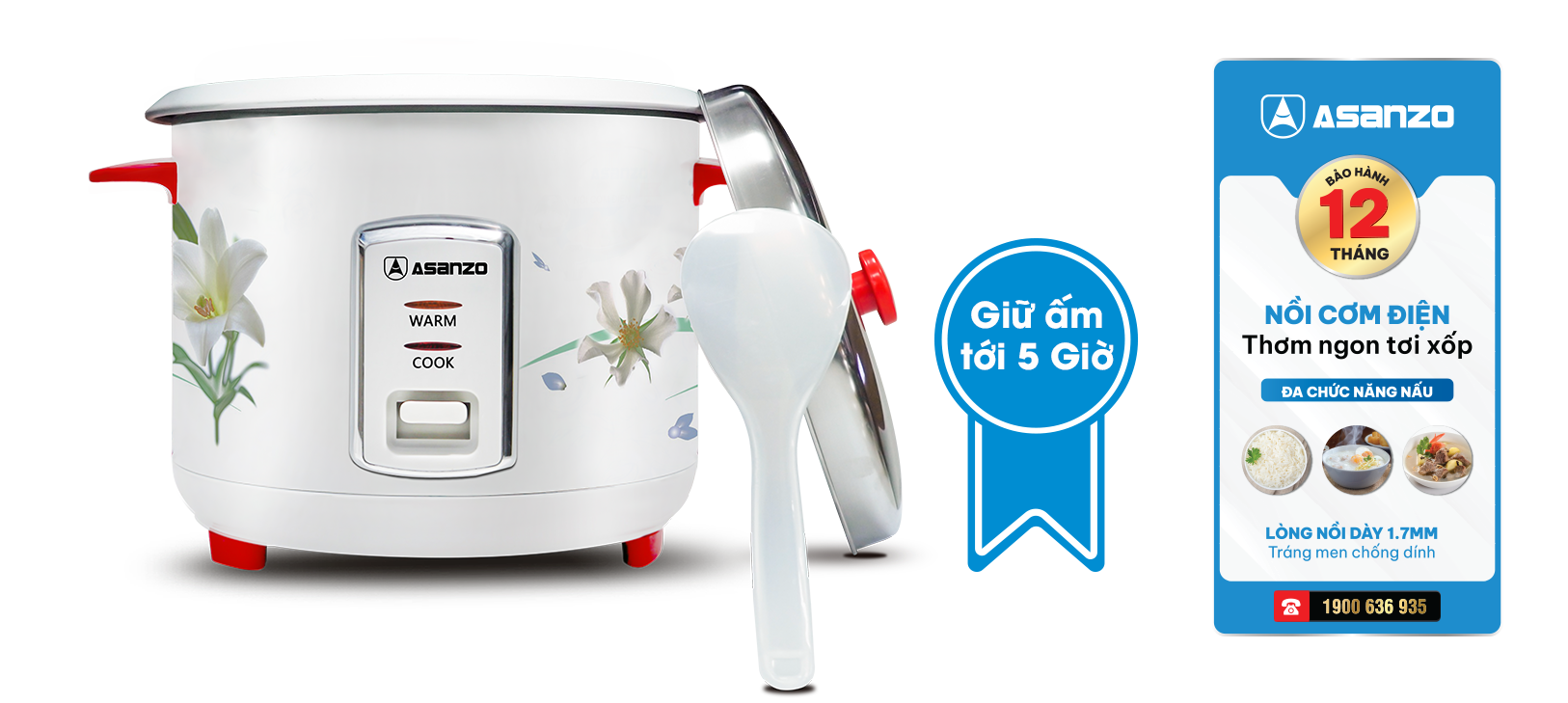 Sản phẩm nồi cơm điện 1.2L Asanzo RC-12WR bảo hành 1 năm chính hãng.