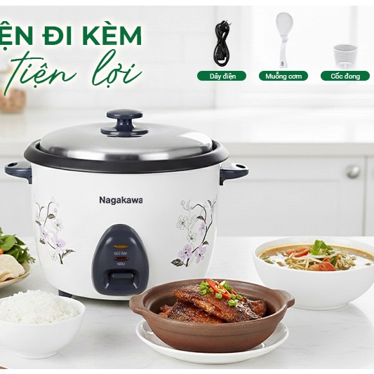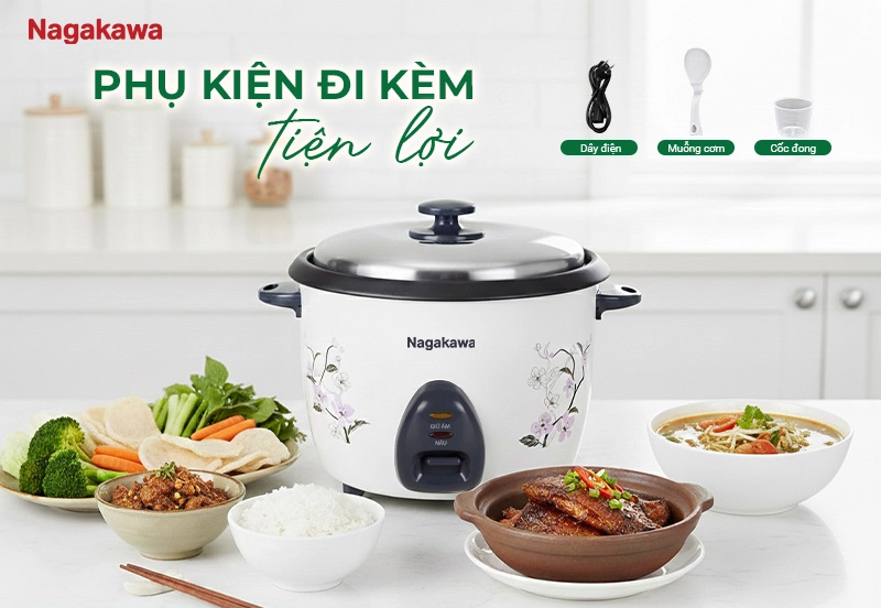 Phụ kiện đi kèm với nồi cơm gồm muỗng xới cơm và cốc đong gạo. Nồi cơm điện Nagakawa NRC3831 dễ dùng và an toàn, giúp việc nấu cơm mỗi ngày trở nên nhanh chóng và tiện lợi hơn.