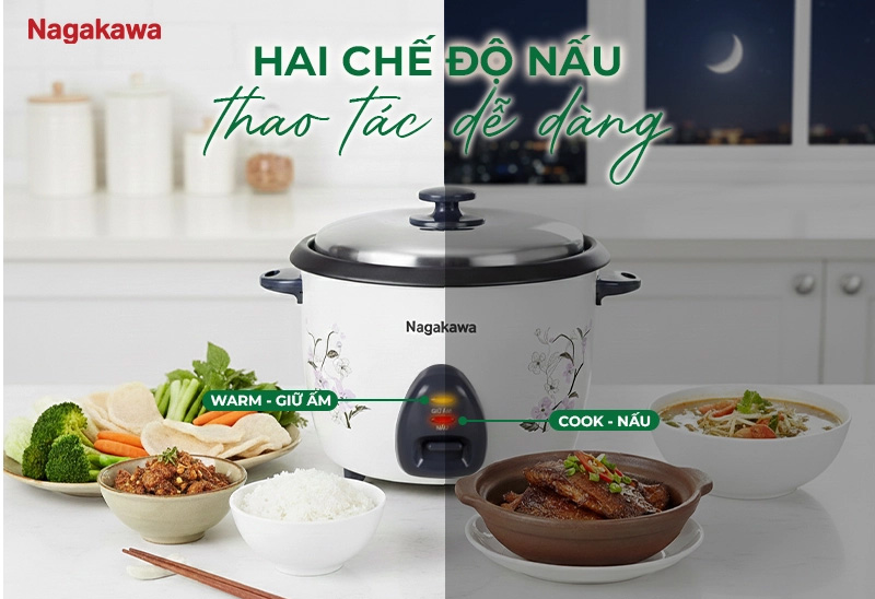 Nồi cơm điện nắp rời Nagakawa NRC3831 có 2 chức năng Nấu và Giữ ấm (thể hiện bằng tiếng Việt) được điều khiển bằng nút gạt rất tiện lợi, bất kì ai cũng đều có thể sử dụng.