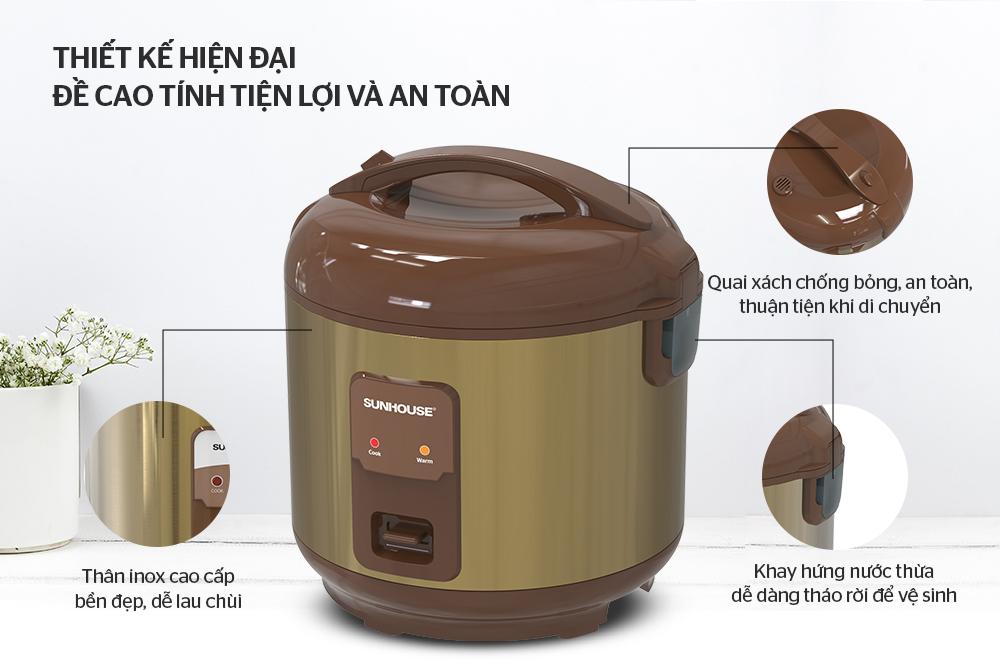 Nồi cơm điện 1.8L Sunhouse SHD8623 có màu sắc bắt mắt, kiểu dáng hiện đại, chắc chắn với thân nồi làm từ chất liệu inox màu bền đẹp. Chất liệu inox với ưu điểm về độ sáng bề mặt, hạn chế bám bụi, dễ dàng lau chùi, đặc biệt vẫn giữ nguyên được vẻ đẹp sau thời gian sử dụng. Phía trên thân nồi được thiết kế quai xách tiện lợi, có thể dễ dàng di chuyển nồi an toàn mà không lo bỏng tay.