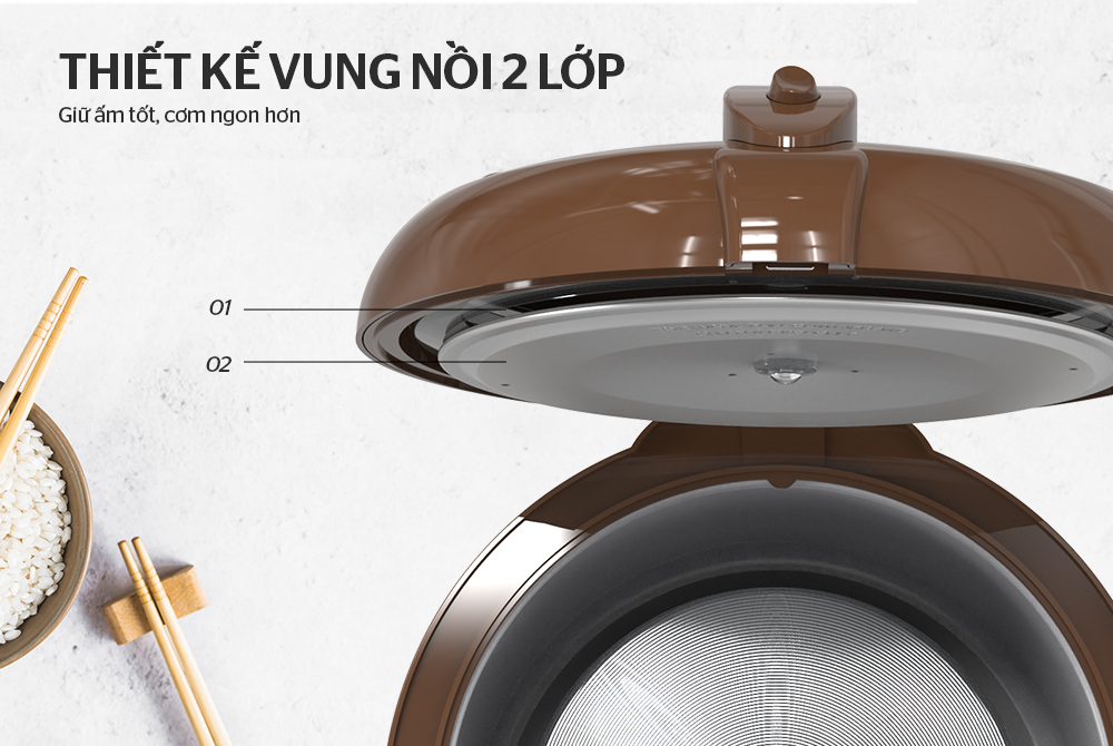 Vung nồi được cấu tạo từ 2 lớp nhôm dày giúp giữ ấm tốt, cơm dẻo thơm, ngon hơn. Kết cấu vung có thể tháo rời giúp bạn vệ sinh dễ dàng và sạch sẽ hơn, không sợ vung nồi bị ám mùi sau thời gian sử dụng.