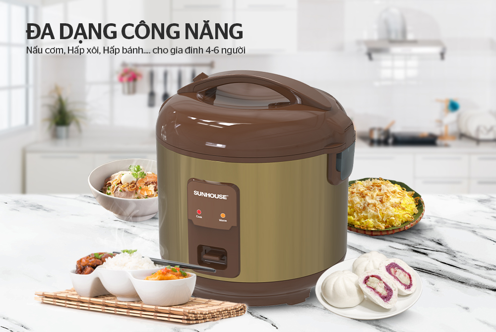 2 chế độ "Nấu - Cook" và "Giữ ấm - Warm" điều chỉnh bằng nút gạt đơn giản, có đèn báo hiệu dễ quan sát. Ngoài ra, nồi có trang bị xửng hấp tiện lợi hấp xôi, hấp bánh bao,...