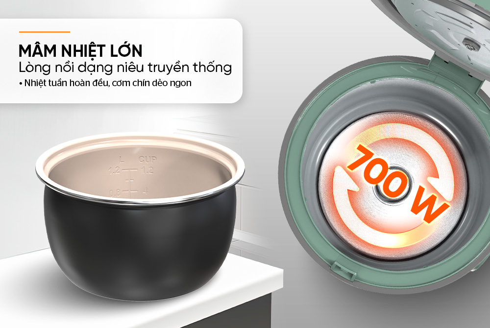 Sở hữu lòng nồi dạng niêu bằng hợp kim nhôm phủ chống dính Ceramic, giúp cơm chín đều, dẻo ngon. Công suất lớn 700W giúp tăng khả năng giữ ấm, cơm nấu nhanh và ngon hơn, tiết kiệm tối đa thời gian và công sức.