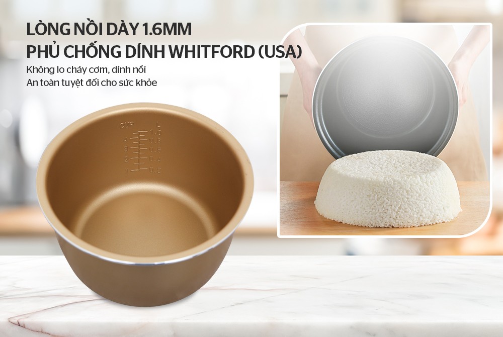 Lòng nồi chắc chắn chịu va đập tốt nhờ độ dày lên đến 1.6mm tốt nhất so với các dòng cùng phân khúc. Độ dày giúp Bên trong phủ chất chống dính Whitford cap cấp của Mỹ, chịu nhiệt cao, an tâm khi sử dụng lâu dài không lo nhiễm các tạp chất khác