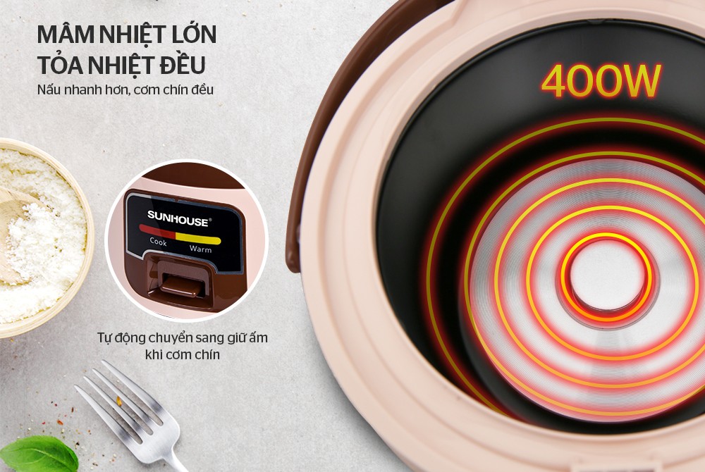 Nồi cơm điện 1L SHD8208C Sunhouse trang bị một mâm nhiệt lớn cùng công suất nồi 400W giúp nhiệt tỏa đều làm cơm chín đều, mềm và ngon hơn.