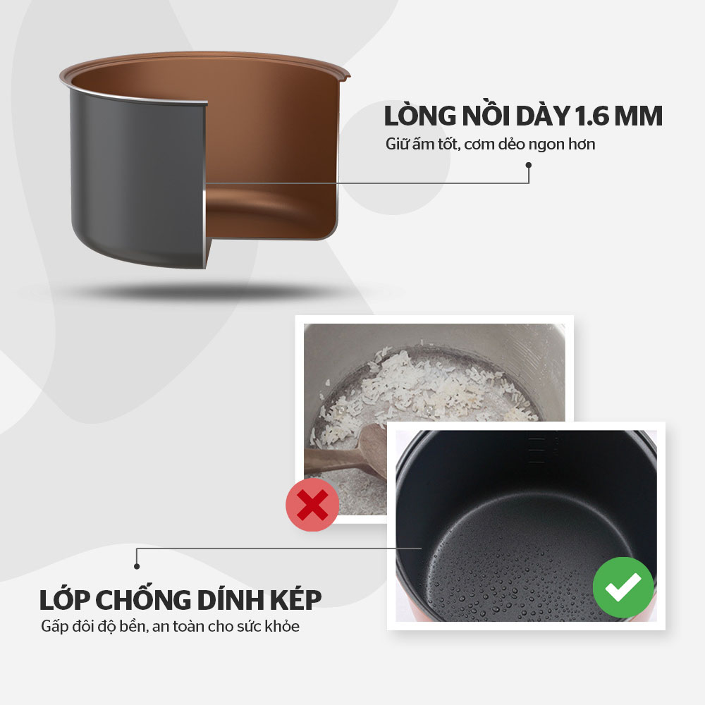 Thiết kế lòng nồi nhôm dày 1.6mm giúp truyền nhiệt tốt, giữ ấm lâu, cơm nấu ra được dẻo hơn, thơm ngon hơn. Đặc biệt, lòng nồi được phủ lớp chống dính kép, tăng gấp đôi độ bền, hạn chế bám dính cơm vào lòng nồi.