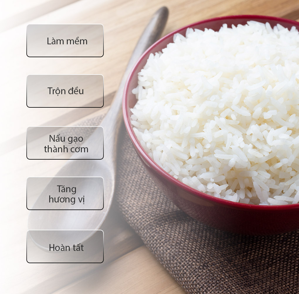 Chu trình nấu tối ưu giữ lại trọng vẹn hương vị của gạo: Làm mềm → Trộn đều → Nấu gạo thành cơm → Tăng hương vị → Hoàn tất.
