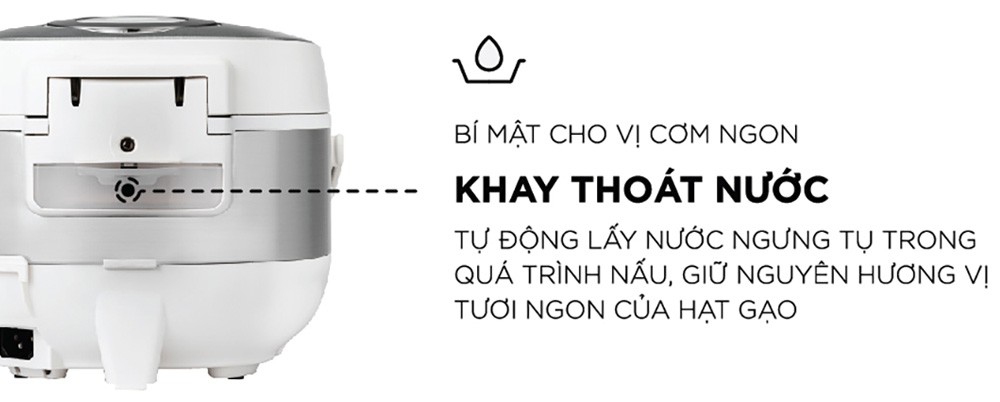 Công nghệ thoát nước thừa mạnh mẽ với khay hứng nước thừa được cải tiến lớn hơn. Làm sạch nước cơm đọng lại bên trong nồi khi nấu, giúp duy trì vị cơm ngon trong thời gian dài.