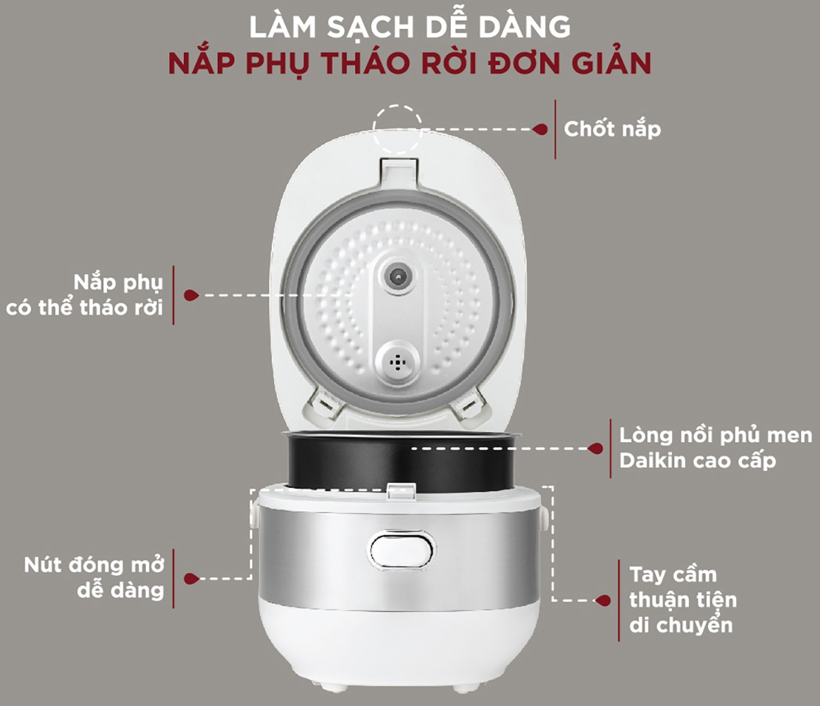 Các bộ phận của nồi cơm như lòng nồi, gioăng, van xả hơi nước đều có thể tháo rời, giúp việc vệ sinh trở nên nhanh chóng và dễ dàng, đảm bảo nồi luôn sạch sẽ và món ăn thơm ngon, không lẫn tạp vị.