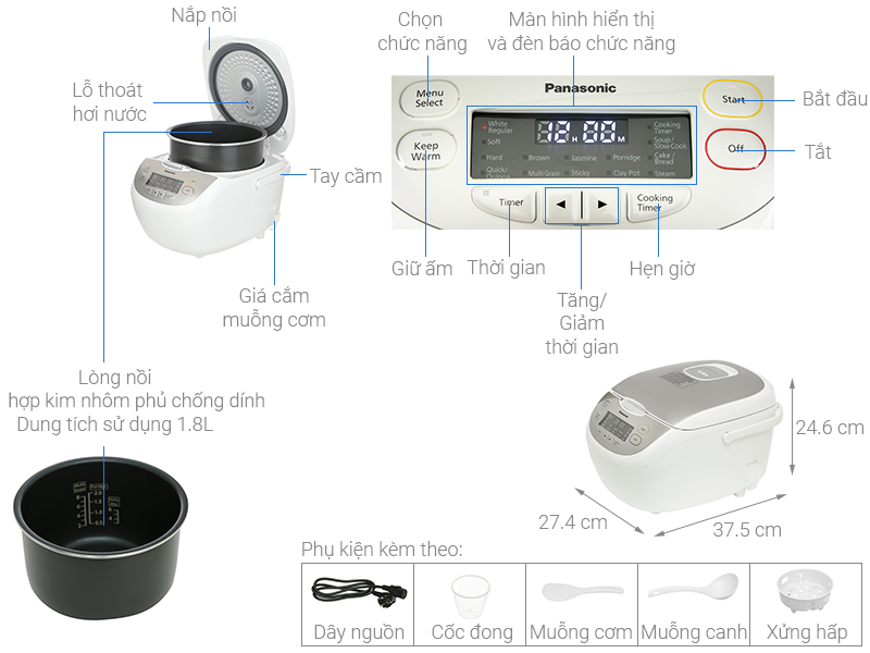 Nồi có dung tích 1.8 lít phù hợp nấu cơm cho 4 - 6 người ăn tương đượng 6 -10 cốc đong theo nồi