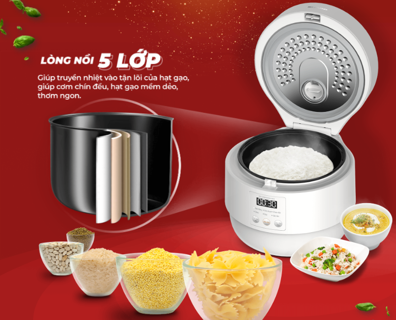 Thiết kế lòng nồi dày dặn 5 lớp giúp truyền nhiệt tốt, cho cơm chín đều, mềm dẻo và thơm ngon.