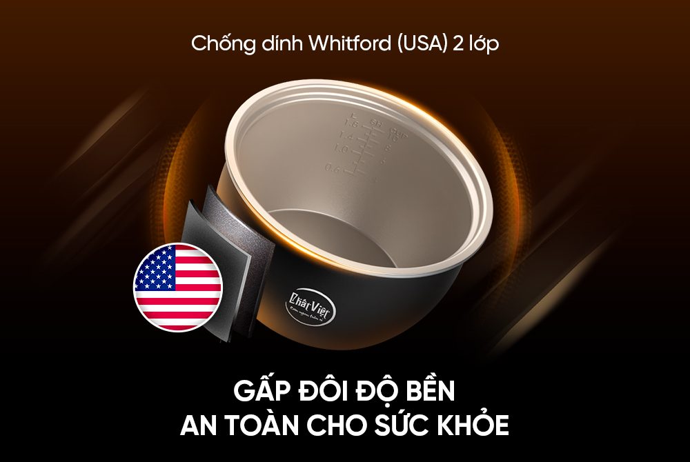 Lòng nồi được trang phủ 2 lớp chống dính Whitford cao cấp, giúp tăng độ bền gấp, giảm tình trạng cơm bám dính vào thành nồi, giúp việc lấy cơm ra dễ dàng và vệ sinh nồi cũng trở nên đơn giản hơn. Không chỉ vậy, lớp chống dính Whitford còn đảm bảo an toàn cho sức khỏe, không chứa các chất độc hại khi nấu ở nhiệt độ cao.