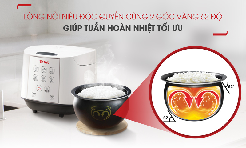 Lòng nồi cơm dạng niêu cùng 2 góc vàng 62 độ giúp tần hoàn hơi nóng cho cơm chính đều, tơi xốp