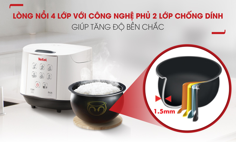 Lòng nồi cơm điện Tefal dày 1.5 mm bằng 4 lớp hợp kim nhôm được phủ 2 lớp chống dính độc quyền của Tefal giúp chống dính tốt, an toàn khi sử dụng.