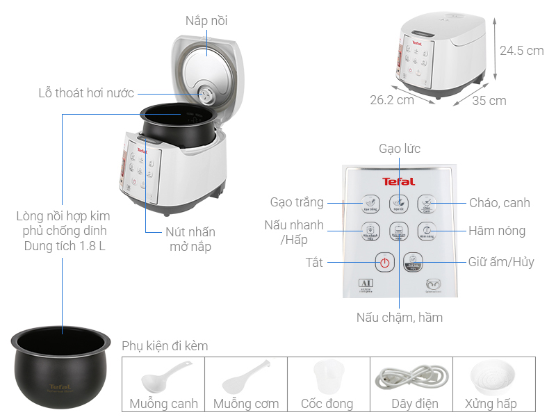 | Dung tích | 1.8 lít ( nấu được 8-10 cốc) |