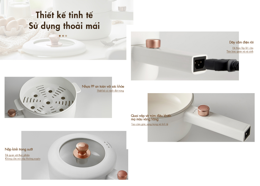 Nồi nấu có vỏ ngoài bằng nhựa PP cao cấp, tay cầm cách nhiệt an toàn sử dụng. Lòng nồi sâu phủ chống dính, không lo thức ăn bám vào, tiện cho việc vệ sinh. Nắp kính trong suốt dễ quan sát bên trong.