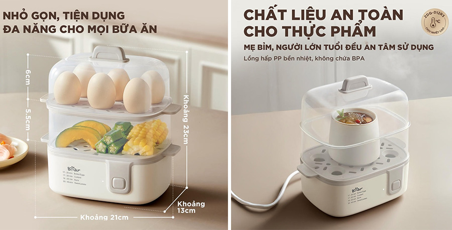 Khay hấp và lồng hấp được làm từ nhựa PP chịu nhiệt, không biến dạng và không chứa BPA khi sử dụng ở nhiệt độ cao. Lồng hấp trong suốt giúp quan sát món ăn trong suốt quá trình hấp.