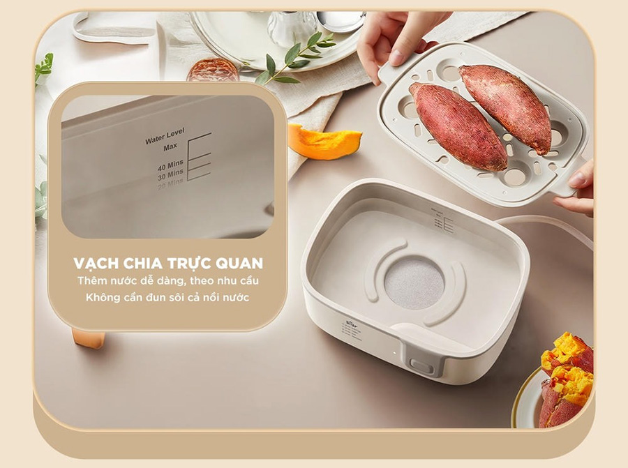 Thiết kế ngăn chứa nước với dung tích lớn kèm vạch chia rõ ràng giúp bạn dễ dàng quan sát và thêm-bớt lượng nước sao cho phù hợp. Ưu điểm của ngăn chứa nước là bạn chỉ cần châm nước 1 lần là đã đủ hấp liên tục 60 phút, giúp món ăn giữ được nhiệt độ ổn định khi hấp và không làm bạn phải ngồi canh chừng hay lo nước bị cạn.