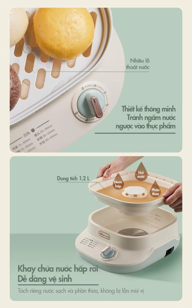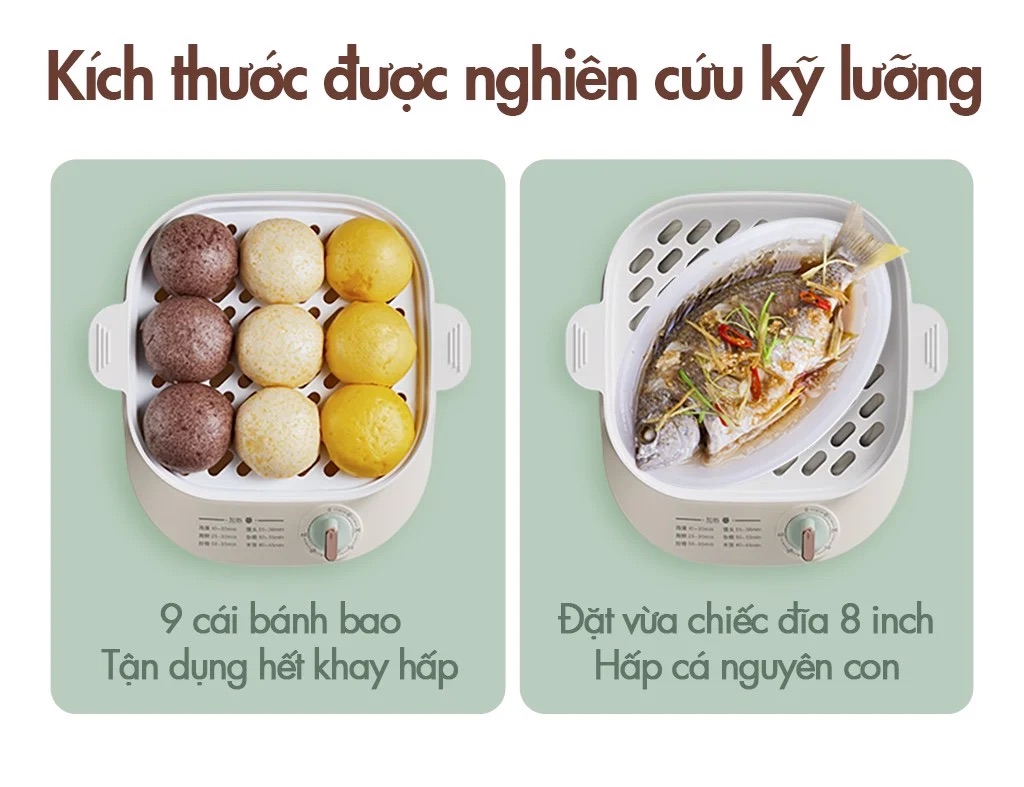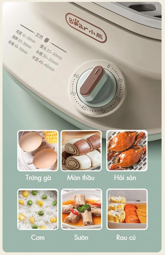 Khi sở hữu nồi hấp điện đa năng Bear DZG-C60Q8, bạn có thể hấp đa dạng loại thực phẩm như hấp hải sản, thịt cá, bánh bao, xôi, cơm,...Bạn sẽ dễ dàng điều chỉnh thời gian hấp bằng với núm xoay (tối đa 60 phút).