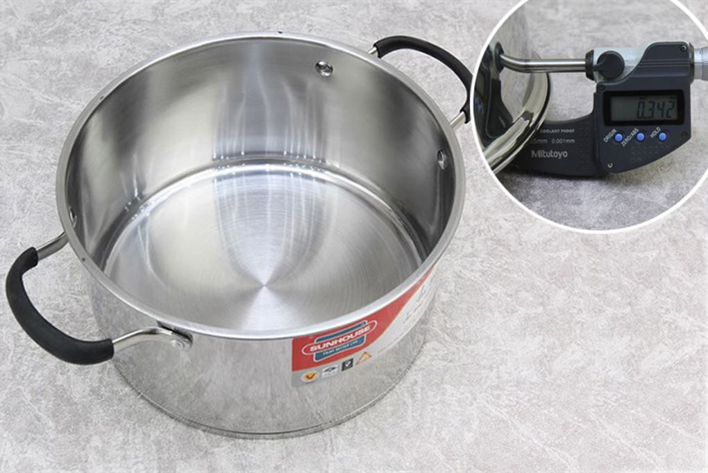 Nồi làm bằng chất liệu inox 430 sáng bóng, ít phản ứng với thức ăn, sáng, sạch. Độ dày nồi 0.3 mm.