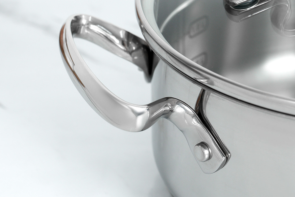 Phần quai cầm 2 bên và trên nắp nồi bằng chất liệu inox, được bắt vít chắc chắn vào thân nồi, đảm bảo an toàn trong quá trình sử dụng, khi cần nâng nhấc hay di chuyển nồi. Quai cầm có khả năng chịu nhiệt siêu bền, chống bỏng, hạn chế trơn trượt.