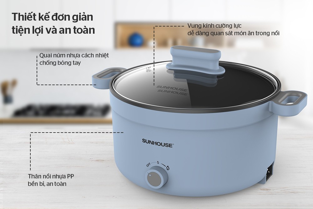 Nồi lẩu điện Sunhouse SHD4528 thiết kế màu xanh pastel thời trang, có thể chế biến cùng lúc nhiều loại thức ăn, tiết kiệm thời gian sẽ là dụng cụ cần thiết ở mỗi gia đình.