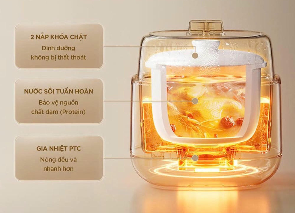 Phương pháp chưng cách thủy giữ trọn dinh dưỡng. Hai lớp nắp khóa chặt giúp hơi nước không bị thoát ra ngoài, bảo toàn 100% dưỡng chất, đặc biệt là các vitamin nhạy cảm với nhiệt. Tạo nên thành quả là món ăn mềm ngon, đậm vị tự nhiên. Ai đang theo chế độ ăn dinh dưỡng, giảm cân thì không nên bỏ qua sản phẩm này.