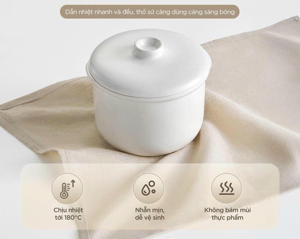 Nồi có 1 thố nhỏ dung tích 0.8 lít được làm từ sứ trắng sở hữu khả năng chịu nhiệt tốt và tỏa nhiệt hiệu quả.